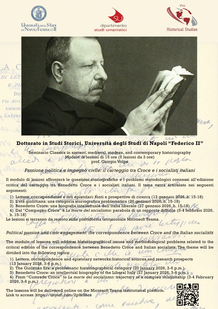 CLASSICS IN ANCIENT, MEDIEVAL, MODERN, AND CONTEMPORARY HISTORIOGRAPHY Modulo di lezioni di 15 ore (5 lezioni da 3 ore) prof. Giorgio Volpe Passione politica e impegno civile: l’edizione del carteggio tra Croce e i socialisti italiani Il modulo di lezioni affronterà le questioni storiografiche e i problemi metodologici connessiall’edizione critica del carteggio tra Benedetto Croce e i socialisti italiani. Il tema verrà articolato nei…