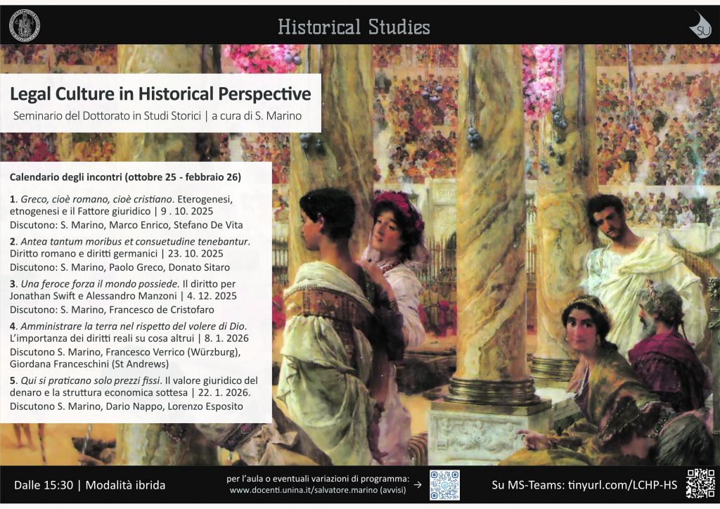 Incontri del seminario dottorale Legal Culture in Historical Perspective per l’anno 2025/26 A cura di Salvatore Marino Seminario con incontri mensili, suddiviso in tranches semestrali. In ogni incontro le relazioni dell’organizzatore e di un altro docente o giovane studioso sul tema proposto sono discusse insieme a tutti i partecipanti. La modalità prevista è ibrida, in remoto (via MS-Teams: https://tinyurl.com/LCHP-HS) e in presenza. Le date…